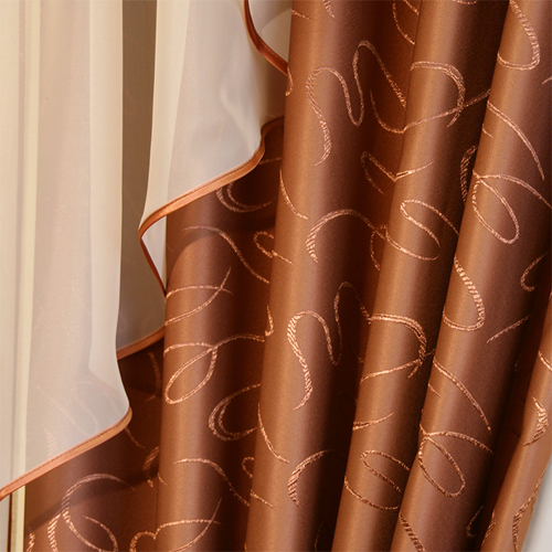 Тюль выполнен из белоснежной вуали, портьеры - из плотной портьерной ткани, цвет шоколадный. Сложный ламбрекен - комбинация портьерной ткани и цветной вуали. Обработка атласной тесьмой. Особую изюминку комплекту штор Paulina придает симметричные вуалевые перекиды.